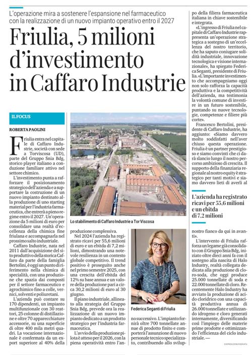 La Presidente di Friulia Federica Seganti ha dichiarato: "L’ingresso di Friulia nel capitale di Caffaro Industrie rappresenta un’operazione strategica a sostegno di un’eccellenza del nostro territorio, che ha saputo coniugare solidità industriale, innovazione tecnologica e visione internazionale. Parliamo di una realtà profondamente radicata nel Friuli Venezia Giulia, con una lunga storia a Torviscosa e un forte legame con il tessuto economico regionale, ma al tempo stesso è protagonista su scala globale nel settore della chimica di specialità, con prodotti ad alto valore aggiunto destinati anche ai mercati esteri.