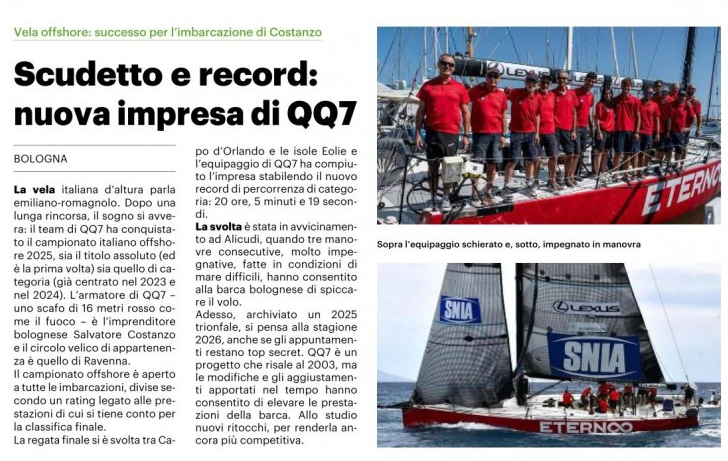 IL RESTO DEL CARLINO, DOMENICA - 26 OTTOBRE 2025 . La vela italiana d'altura parla emiliano-romagnolo. Dopo una lunga rincorsa, il sogno si avvera: il team di QQ7 ha conquistato il campionato italiano offshore 2025, sia il titolo assoluto (ed è la prima volta) sia quello di categoria (già centrato nel 2023 e nel 2024). L'armatore di QQ7 uno scafo di 16 metri rosso come il fuoco - è l'imprenditore bolognese Salvatore Costanzo e il circolo velico di appartenenza è quello di Ravenna.